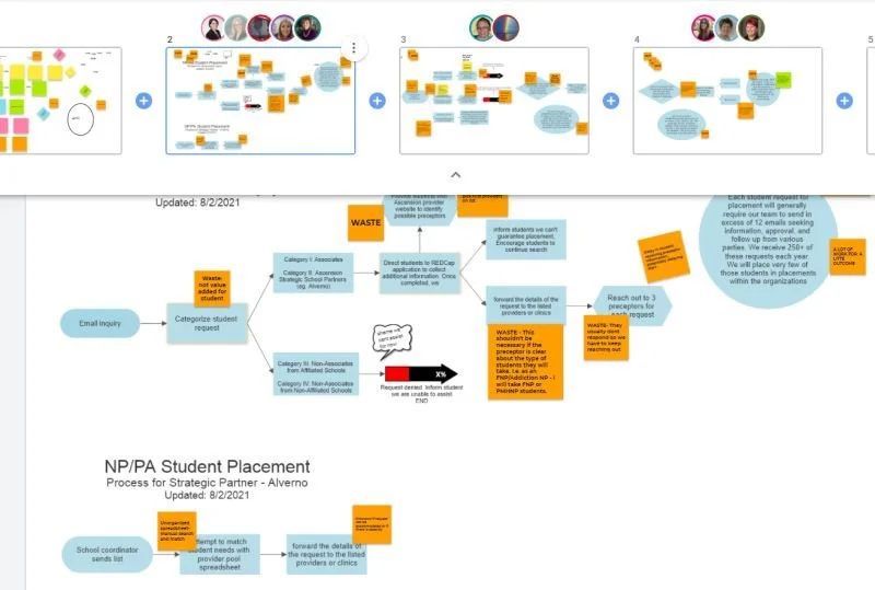 This is a snapshot from a Rapid Improvement Event from earlier today. Even though we wanted to be in person placing sticky notes on a parchment paper, we leveraged some existing technology to do "the same thing". I remembered to "talk less, smile more" as I watched the small icons pop up on the screens showing where participants were sharing their initial feedback on the current process. It was reassuring that they were actively participating and engaged in the final activity. Of course, I immediately sent out a survey asking for feedback so I can pivot before the next meeting on Wednesday. Ah, it always feels good to be doing the work you love to do. #continuousimprovement #valuestreammapping #processimprovement #healthcare #leanthinking #projectmanagement #leadership